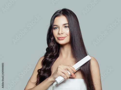 Beautiful Woman With Long Straight Hair And Curly Hair Using https://stock.adobe.com/br/images/beautiful-woman-with-long-straight-hair-and-curly-hair-using-hair-straightener-cute-smiling-girl-straightening-healthy-brunette-hairstyle-with-flat-iron-hair-problem-and-haircare-concept/241444883